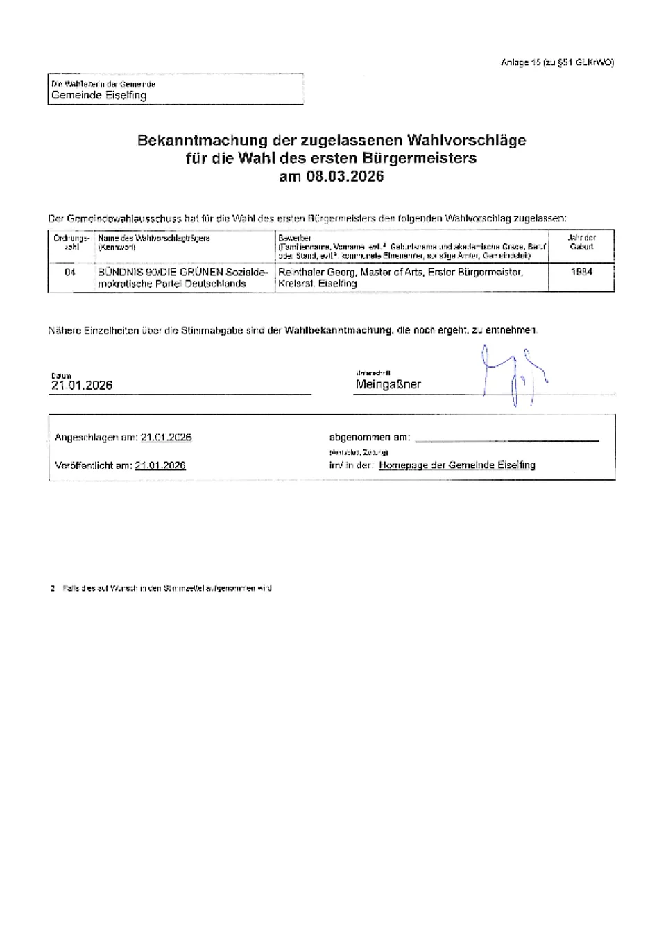 Bekanntmachung der zugelassenen Wahlvorschläge für die Wahl des Ersten Bürgermeisters am 8. März 2026.