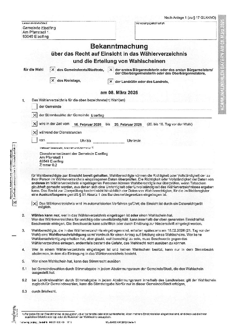 Bekanntmachung über das Recht auf Einsicht in das Wählerverzeichnis und die Erteilung von Wahlscheinen für die Wahl des Gemeinderats, des Ersten Bürgermeisters, des Kreistags und des Landrats am 8. März 2026.
