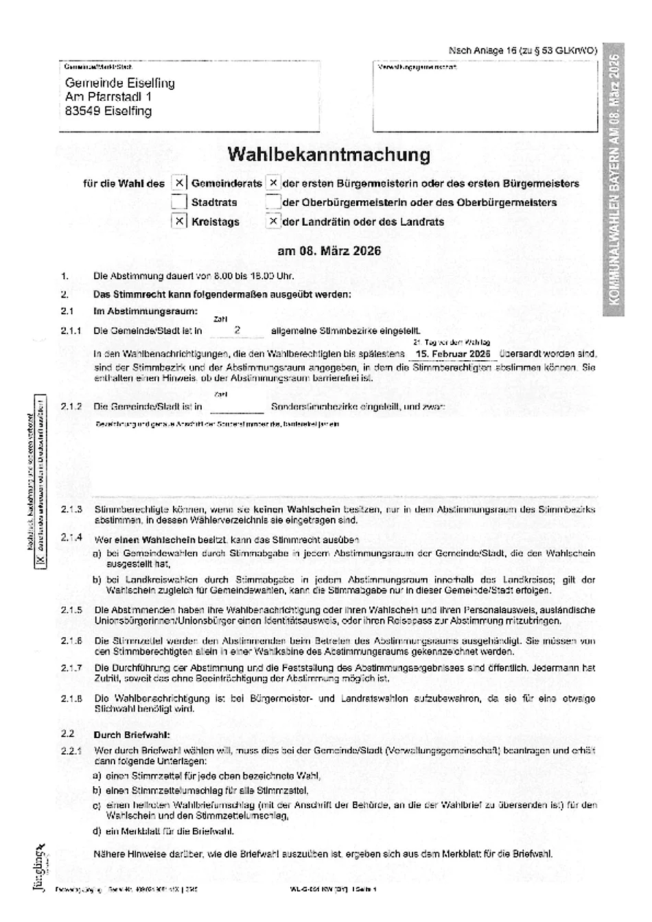 Wahlbekanntmachung für die Wahl des Gemeinderats, des Ersten Bürgermeisters, des Kreistags und des Landrats am 8. März 2026.