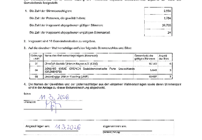 Bekanntmachung: Abschließendes Ergebnis der Gemeinderatswahl am 8. März 2026