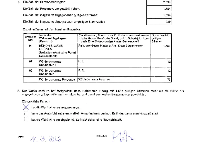 Bekanntmachung: Abschließendes Ergebnis der Bürgermeisterwahl am 8. März 2026